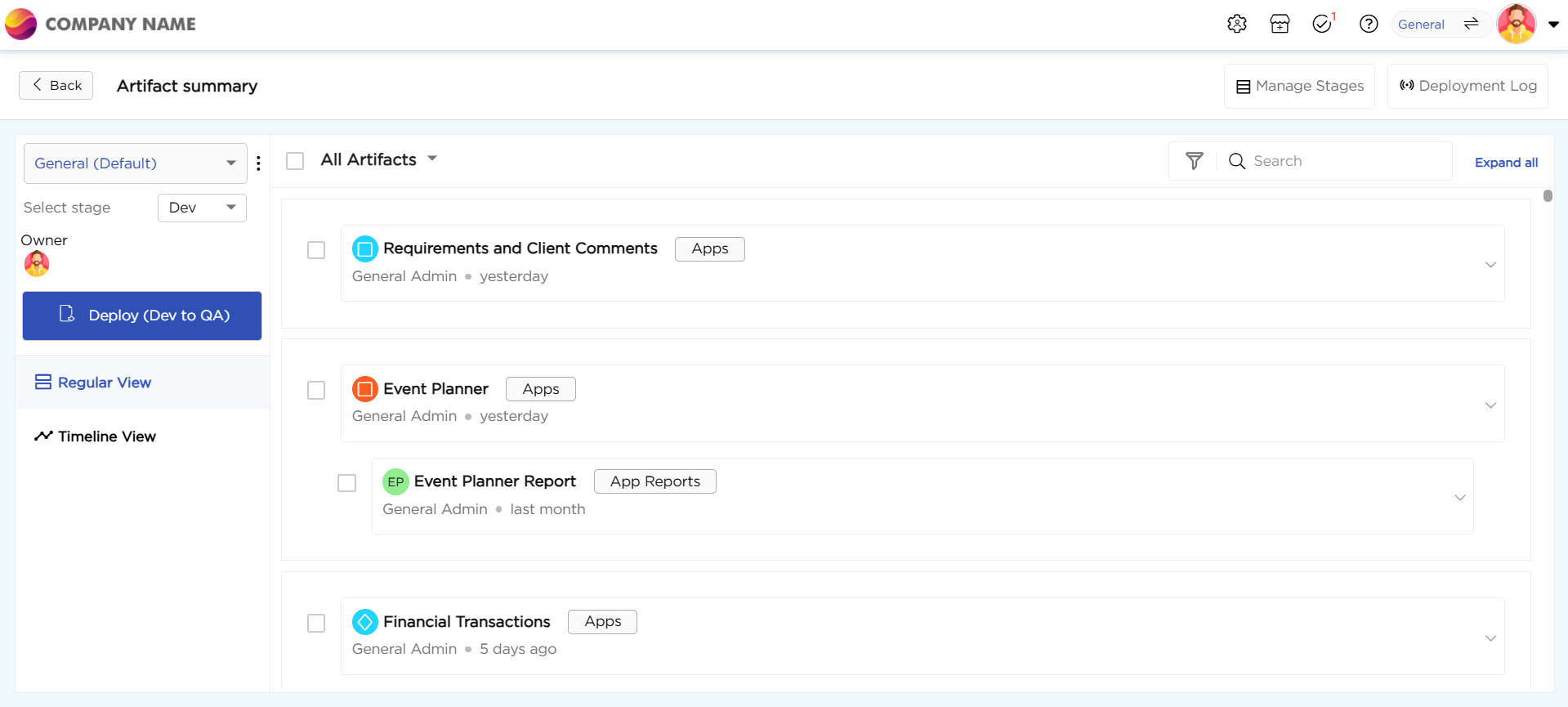 Publishing is performed from the Artifact Summary page in the Dev stage. From this page, you can: