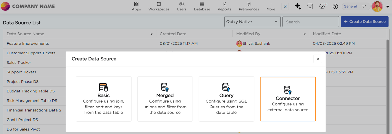 A Connector Data Source links Quixy with external systems or APIs to fetch real-time data without storing it inside the platform. It is ideal for data that changes often, such as stock levels, account balances, or order details.