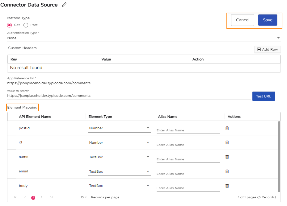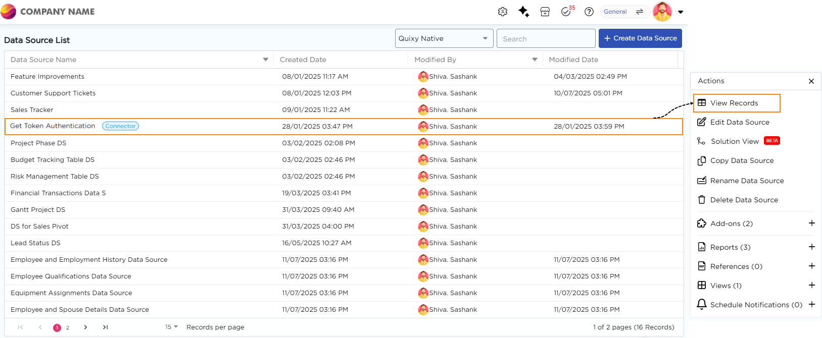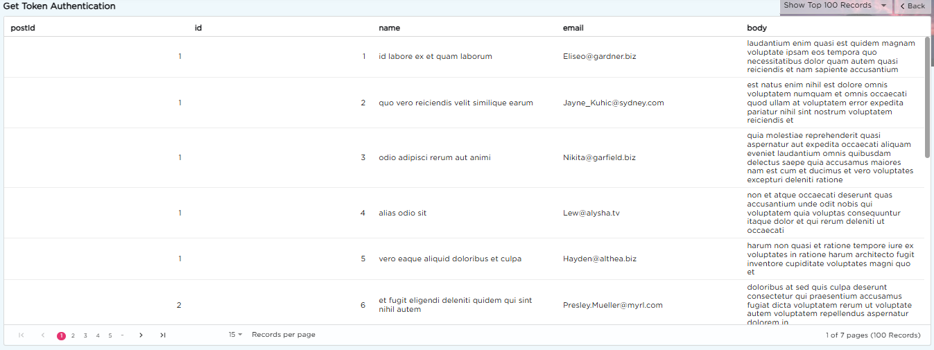 When you select the Connector Data Source and click View Records, the live data fetched from the external API is displayed in a tabular format. Each row represents data pulled directly from the connected system in real time.