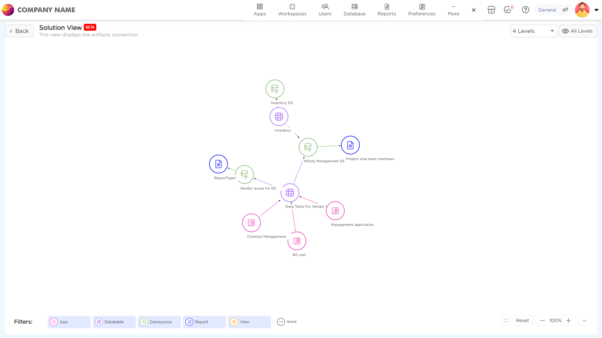 With the ability to visualize up to 20 levels of connections, the Solution View gives a comprehensive perspective on artifact relationships directly within the platform. Advanced filtering options help declutter the view by applying predefined filters such as Apps, Data Tables, Data Sources, Data Reports, and Views. You can also apply more specific filters like App Reports, Triggers, External Connections, Lookups, and Payment Gateways to narrow the focus further.