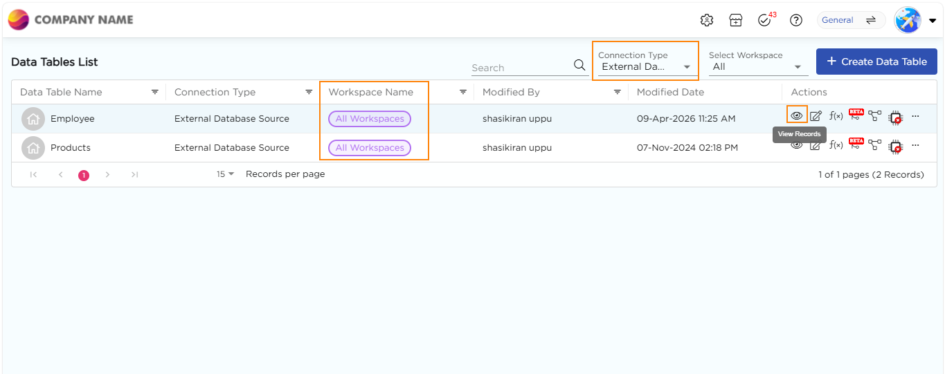 The created data table now appears in the list along with its connection type and workspace details. Refer to the images below.