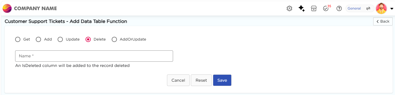 The Delete function removes a record from the data table when a matching value is received from the application. This is used to delete existing records, such as when a user cancels a request or removes an item in the app.