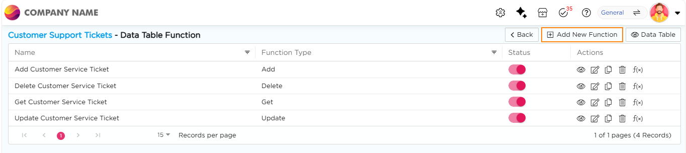 3. Click + Add New Function. You will land on the Add Data Table Function page.