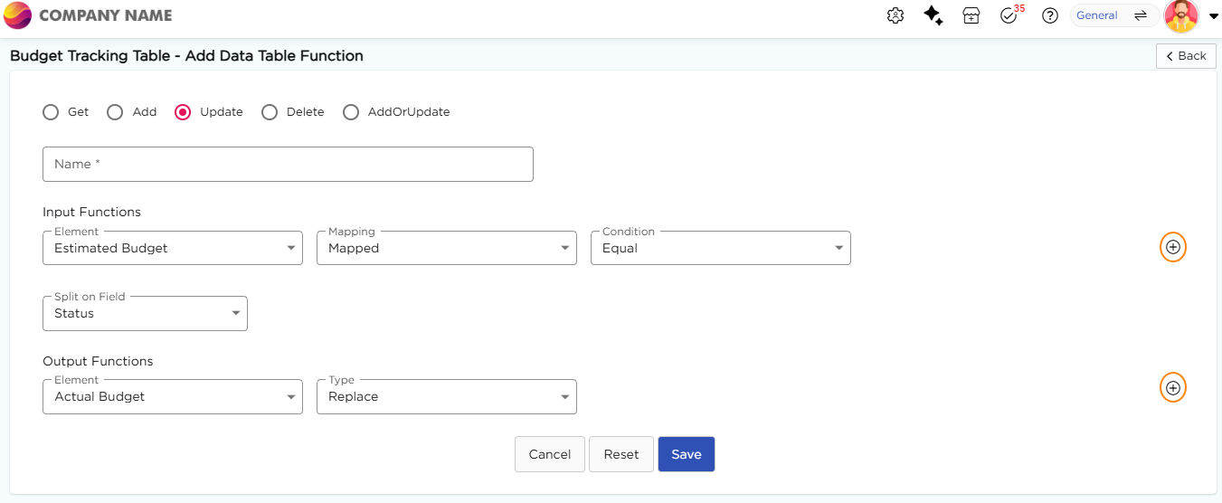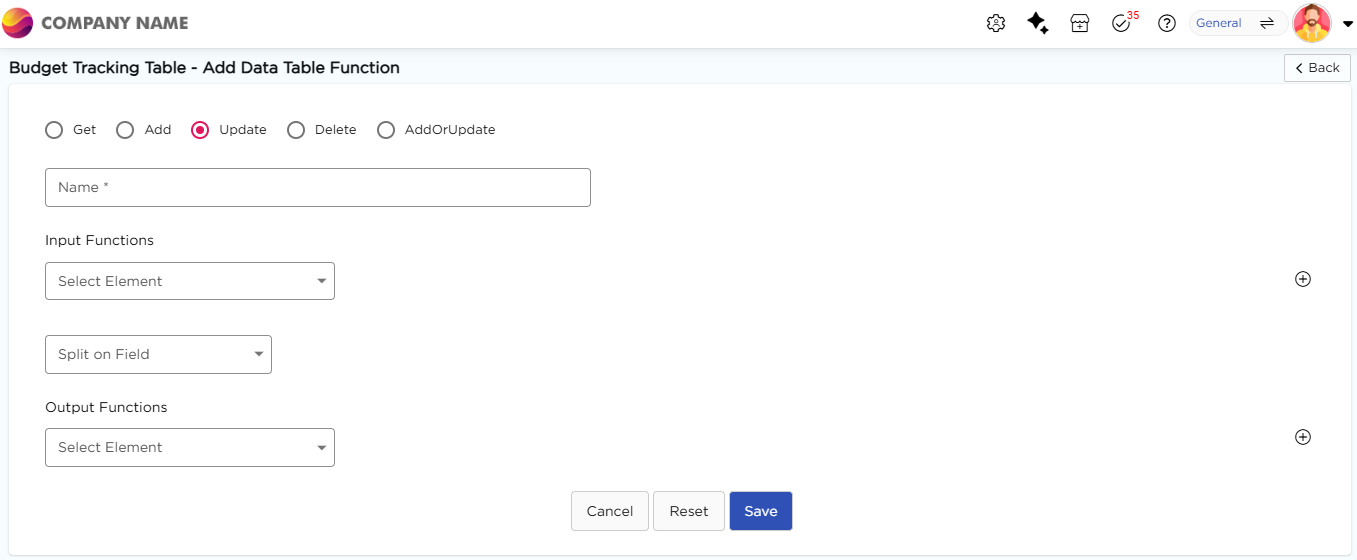 4. Select Update as the function type and enter a name for the function.