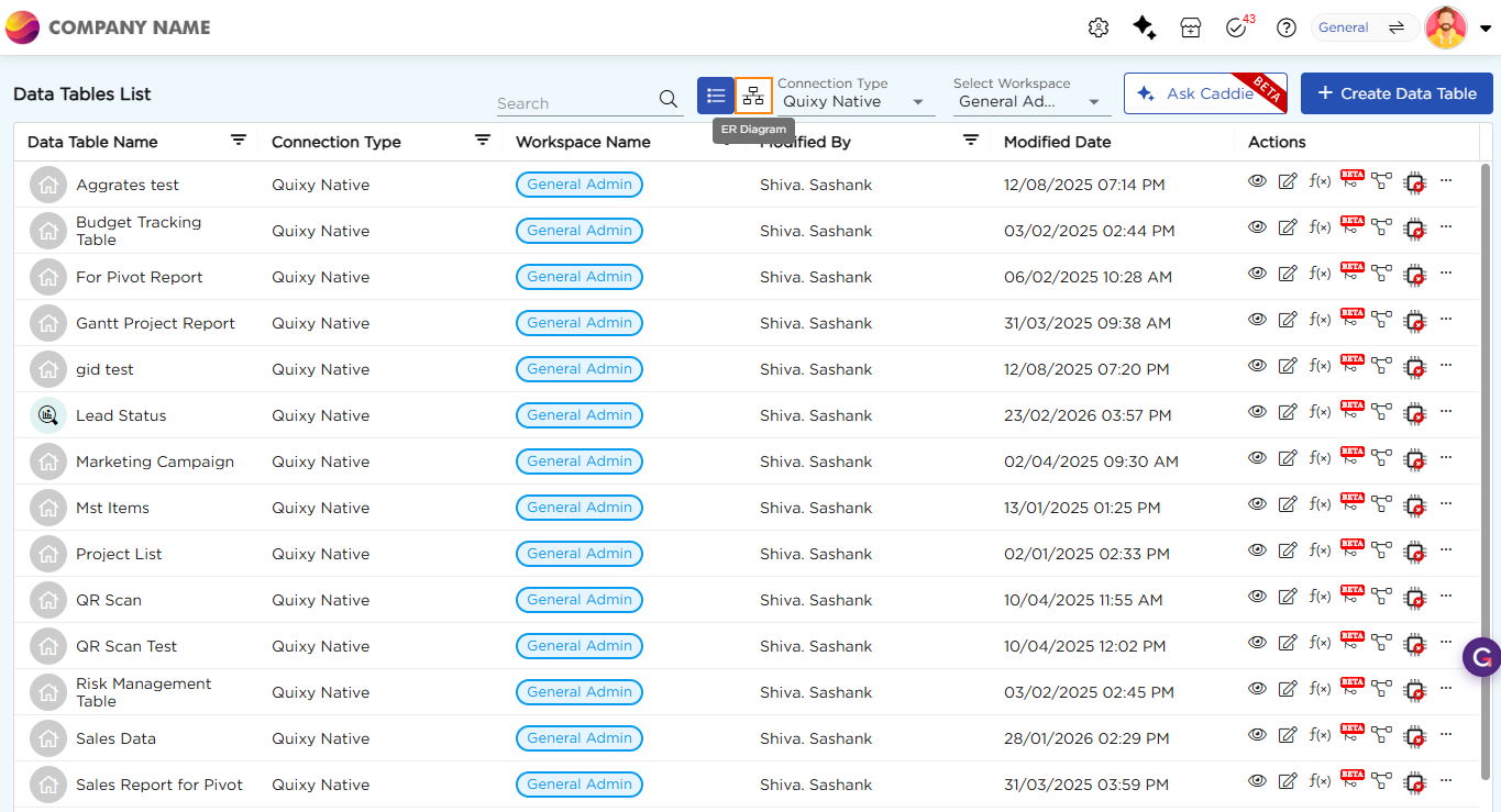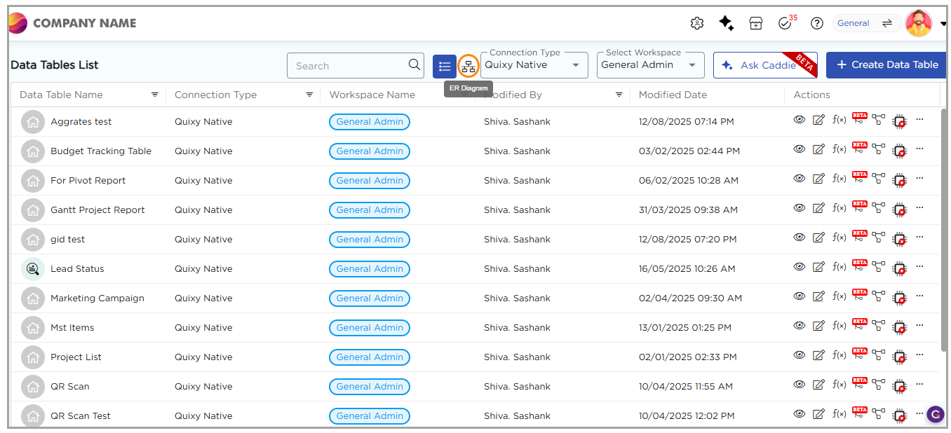 The ER View in Quixy provides a visual representation of all data tables within a workspace, along with their columns and the relationships between them. It helps users understand how tables are structured and interconnected, making it easier to design, manage, and troubleshoot data models.