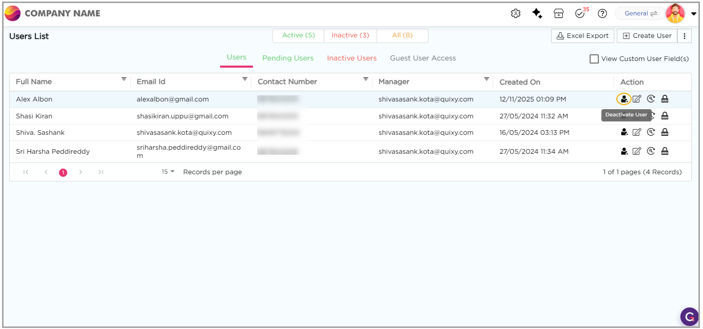 Deactivating a user removes their access to the platform while ensuring that ongoing work is not disrupted. Before deactivation, you must reassign the user’s responsibilities.