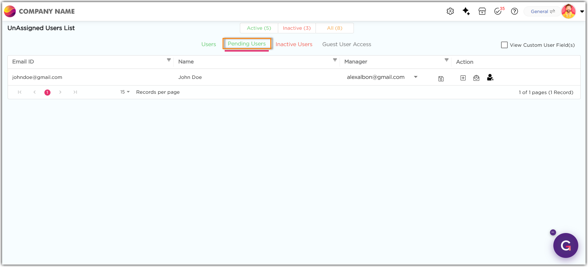 Newly created users remain in the Pending Users list until they are activated. An inactive user cannot perform any actions on the platform till they are active.